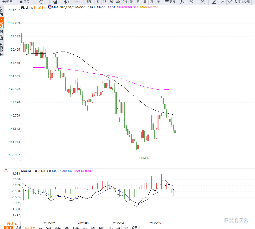 当前汇价已经接近61.8%斐波那契回撤位143.20附近,若有效跌破该区域,将打开下行空间至143.00、142.35甚至142.00一线。日线动能指标转空,而4小时相对强弱指标(RSI)接近超卖,表明短期内可能出现一定整理,但整体趋势偏弱。